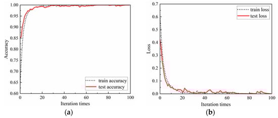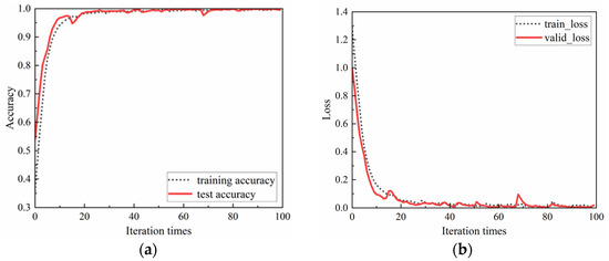 Comparing Figure 10 and Figure 16, it can be seen that the proposed multi-sensor fusion rail surface defects recognition method based on VMD grayscale image coding, and DCNN can quickly converge and tend to be stable in both four-class and two-class applications, and the accuracy is higher. It shows that this method has a certain robustness and generality. Five repeated tests results of the classification accuracy of the two categories has reached 100%.