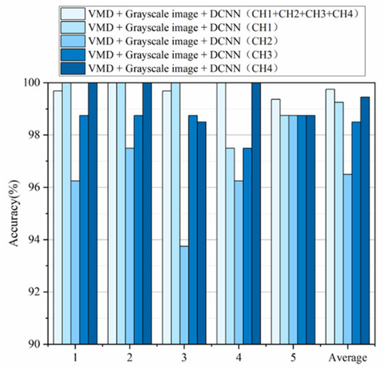 (1) The parameter-optimized VMD is used to decompose the original vibration acceleration data measured by the four-channel sensors of the axle box, and the IMF component with the largest correlation coefficient between the eigenmode components of each order and the original signal is screened and converted into a grayscale image as the input of DCNN; it avoids the selection of the optimal sensor layout position and reduces the demand for the tester’s actual test experience;