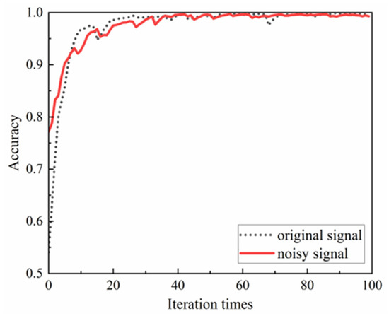 Run the network five times, and Figure 18 shows the recognition accuracy and loss rate of the test set obtained after five cycles of noise adding. Among them, Figure 18 shows the comparison of test set accuracy change curves of the first test results before and after noise addition. It can be seen from Figure 19 that the overall change trend of the two curves is very close. The average accuracy of the final recognition after noise-added is slightly reduced, and the average test accuracy is 99.20%, which is slightly lower than the average test accuracy of the original signal of 99.75%. It shows that the addition of noise image has very little impact on the network, which proves that the DCNN network model proposed in this paper has strong anti-noise ability.