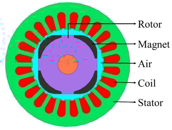 In this study, we used a BLDC motor with a rated output of 1.5 kW, 4 poles, and 24 slots, as shown in Figure 1. Table 1 summarizes the specifications of the BLDC motor.