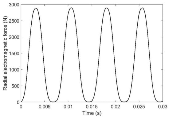 The radial EM force acting on the stator tooth was calculated as shown in Figure 4. Vibration analysis was performed by inputting the calculated radial EM force into the stator structure.