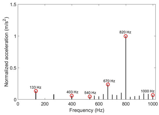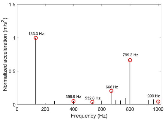 The harmonic components of the EM force calculated through the EM analysis were applied to the stator tooth of the 3-D finite element model. Transient analysis using the EM–structural coupled analysis method was performed to calculate the acceleration response in the finite element model of the BLDC motor shown in Figure 5. Fast Fourier transform was performed to obtain the normalized frequency response curve shown in Figure 6.