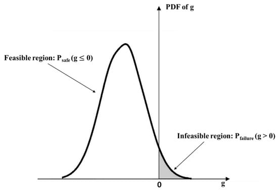 RBDO is used to design a product that satisfies the reliability as per the requirement of the designer by quantitatively defining uncertainty. Therefore, reliability analysis is necessary to accurately predict the failure probability of a constraint condition. Reliability is a design condition in product design that refers to satisfying the required performance. The design variable is defined as a probability variable X to consider reliability quantitatively. A performance function representing the required performance is defined as g to evaluate the reliability of a product. As shown in Figure 8, the performance function is expressed as a probability density function, and at the performance function equals 0, it is divided into a feasible and an infeasible region that satisfies the constraint condition. The probability of product damage is obtained by calculating the area where g > 0 in the probability density function curve shown in Figure 8. Reliability increases as the probability of damage decreases [27].