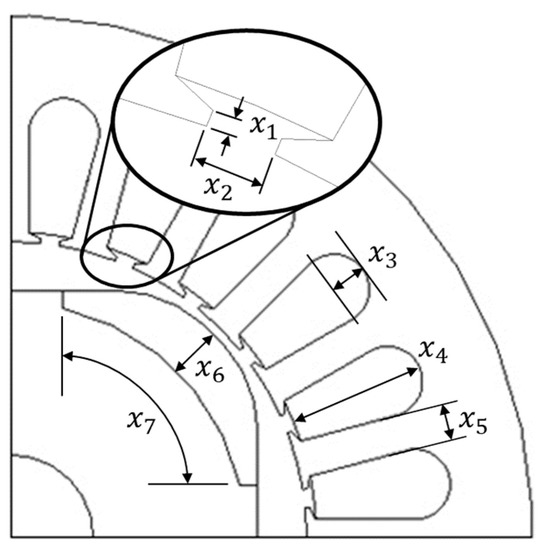 represents the seven design variables that determine the shape of the motor, is a function of output torque, and and represent the functions of torque ripple and magnet area, respectively.