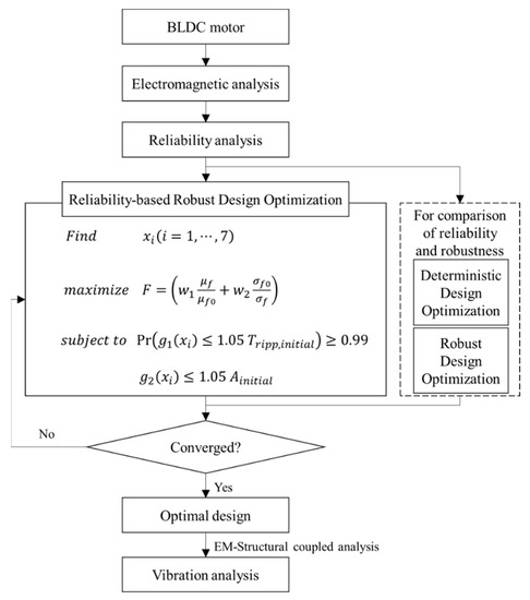 Equation (13) is the formula for the problem of RBRDO, which increases the robustness of the performance and reduces the failure rate by considering the manufacturing uncertainty of the BLDC motor. Figure 11 shows the RBRDO flowchart. The objective function is the same as the formulation of the RDO. The constraint condition is the failure rate; 99% reliability is achieved within the +5% change rate compared to the initial torque ripple. In this study, we used the system reliability optimization method for the RBRDO of the BLDC motor. This method is suitable when there are various constraints [32].