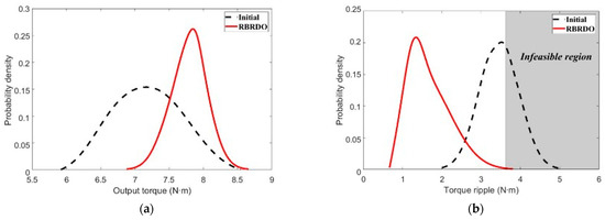 Comparison of probability distribution results of (a) output torque and (b) torque ripple in the initial design and RBRDO.