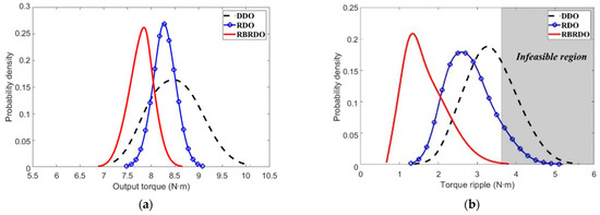 Comparison of DDO, RDO, and RBRDO results for (a) output torque and (b) torque ripple.
