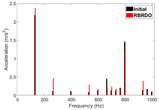 To compare the vibration responses of the initial BLDC motor and RBRDO model, EM–structural coupled analysis was performed. Figure 14 shows the frequency response graph of the vibration analysis results. It is a response to the EM force. The fundamental frequency of 133.3 Hz increased by 9% from 2.18 m/s2 to 2.38 m/s2 due to the energy density increase. However, the response at 400 Hz and the frequency component of torque ripple decreased (by 18.2%) from 0.11 m/s2 to 0.09 m/s2. We used the root mean square (RMS) method to compare the magnitude of the vibration response from 0 to 1000 Hz. The RMS value of the vibration response of the initial BLDC motor was 0.748. The RMS value of the vibration response of the RBRDO model increased by 2% to 0.763. However, since the output torque increased by 9% with RBRDO, we could confirm that a higher increase is possible in the output torque than the magnitude of the vibration response.