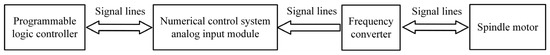 The motor power acquisition module consists of a frequency converter, an analog input module of a numerical control system, and a PLC module, which performs the analog-to-digital conversion of the motor power. The frequency converter’s analog output module outputs motor power. The numerical control system’s analog input module receives the analog signal and completes the analog-to-digital conversion. Using system variables, a PLC may determine the spindle motor’s power.