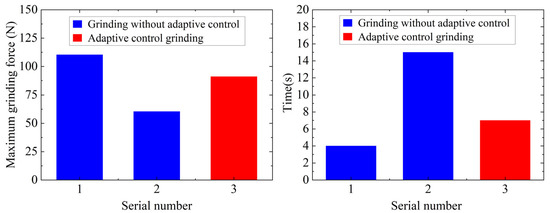We compared and analyzed the results of the three groups of experiments. It can be observed in Figure 11 that, without adaptive control, the maximum grinding force is 60.39 N and the processing time is 15 s when the feed rate is 2.4 mm/min. When the feed rate is 12 mm/min, the maximum grinding force is 110.44 N and the processing time is 4 s. At this time, the maximum grinding force exceeds 100 N. Under the adaptive control condition, the initial feed rate is set to 7.2 mm/min. When the grinding wheel first cuts the workpiece, the grinding force is small, and the feed speed is increased to 10 mm/min by adjusting the adaptive control system. With the change in grinding force, the adaptive control system automatically adjusts the feed speed. In the grinding process, the maximum grinding force is 91.16 N and the processing time is 7 s.