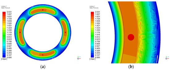 Figure 9a,b. The maximum pressure is distributed at the inlet position and spreads outward through the oil pad, the average pressure is 1.56 MPa, mainly concentrated in the oil pad position. In the textured area, it is found that a large number of pressure perturbation phenomena are produced around the microtexture and the pressure is diffusing into the outlet gradually, by calculating it, we obtain an average pressure of 1.69 MPa. The initial temperature is 296 K in the inlet position, and the maximum temperature is 307 K, which occurred in the outlet position. An enlarged view of the temperature of the textured area is shown in
