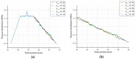 Figure 10. The node position from 58 to 68 is the texture area, and it can be found that the oil supply pressure of 2 MPa gradually spreads from the oil inlet position to both outlet sides, the pressure distributions are almost equal on the orifice inner side; in the microtexture area, the different pressure distribution varies with height. Average pressure in textured area with various heights has the following relation: