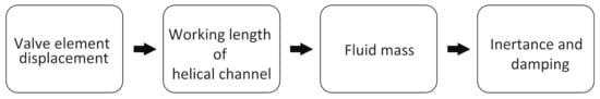 Let br the helical channel pitch, D be the valve element diameter, x be the relative displacement between the valve cylinder and the valve element, be the piston diameter, be the piston rod diameter, and be the helical channel radius. Then, , and in Equation (2) can be expressed as