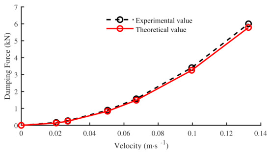 Furthermore, the experimental and theoretical values of the damping force and velocity corresponding to six working conditions under this valve element displacement are shown in Figure 9. The test values are essentially consistent with the theoretical values, which means the new mathematical model proposed in Section 3.3 can provide an accurate representation of the actual damping of the adjustable device.