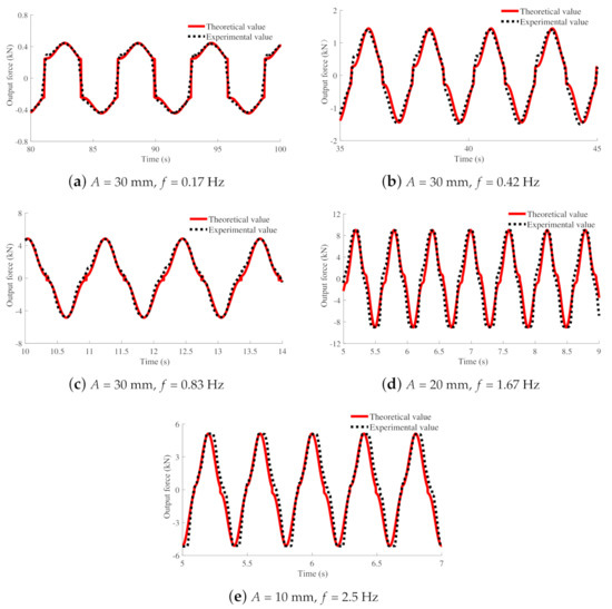 There are a total of 50 test data processing conditions; however, due to limited space, this paper extracted some representative test data processing results. Take the valve element displacement x = 30 mm as an example. The experimental and theoretical values of the output resultant force, damping force and inertial force of the device are shown in Figure 11, Figure 12 and Figure 13. The curve trends of the test value and the theoretical value of the device’s output force are roughly the same at 0.17 Hz, and are manifested as the coupling of square waves and triangular waves.