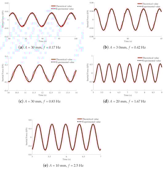 The sinusoidal displacement input is used in the dynamic performance test of the device to separate the inertial force. Limited by the maximum bearing capacity, the test scheme chose sine waves with an amplitude of 30 mm and frequencies of 0.17, 0.42 and 0.83 Hz, an amplitude of 20 mm and a frequency of 1.67 Hz and an amplitude of 10 mm and a frequency of 2.5 Hz as the input. The steps of separating the inertial force are as follows: