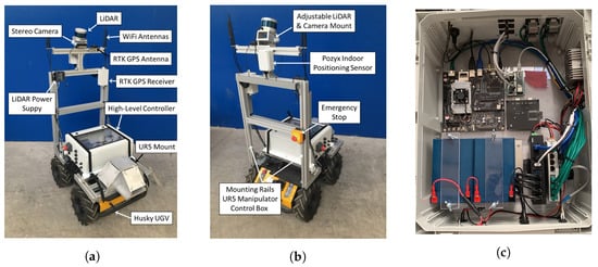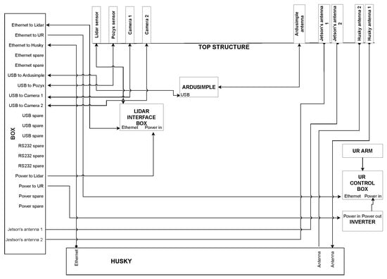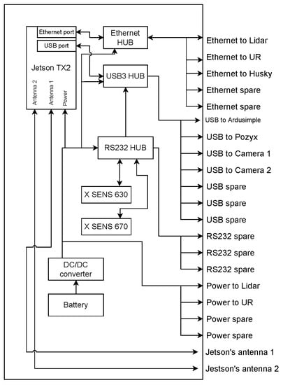We decided to mount these devices on a single platform so that they can be rotated together to shift their vertical fields of view. This makes the data more accessible and reliable for both systems by minimizing the amount of re-calibration necessary when repositioning them. Concerning the manipulator, a Universal Robots UR5e manipulator [37] has been considered. As shown in the system layout, it is placed in the front part of the vehicle to ensure adequate clearance. In addition, a pyramid-like structure has been designed for the front of the Husky. The form of this structure permits the base of the robotic manipulator to be mounted in different orientations, which allows us to test our system’s ability to re-tune itself when it is reconfigured automatically. A detailed design configuration for the concept is shown in Figure 2. The designed robot frame (Figure 2) provides the mounting points for all modules. We have decided to use the onboard computer provided with the Husky UGV for the low-level control processes and use a second computer in a newly designed control box (high-level control box) to support electronics. The battery onboard the Husky UGV can provide electrical power to additional sensors that may be required, e.g., LiDAR, stereo camera, and RTK-GPS (outdoor), or ArduSimple simpleRTK2B [38] or iPS (indoor) positioning system, e.g., Pozyx [39]. Fieldwork can severely limit the ability to collect data, as no main power is typically available for recharging. The battery in the second control box is included to increase the time the robot can be operated without needing to stop to recharge. The system can either be run for long periods when attached to the main power line for debugging in the lab or run automatically for several hours in the field. In addition to the batteries, additional connectors, cables, a Ethernet bridge, a USB hub, and RS232 serial interfaces (designed through a set of Arduino Teensy micro-controllers) are used to integrate the high-level computer and different sensors, as well as to interface with the low-level computer in the Husky and the UR5 robotic manipulator. Lastly, an emergency stop push button has been added to ensure that the system can be rapidly disabled during field testing in case of unexpected behavior of the vehicle control system. Block diagrams of the overall electronics configuration and the high-level control box can be seen in Figure 3. In general, the heavy components (i.e., the UR5e manipulator, the UR5e manipulator control box, and the high-level control box with internal batteries) are distributed uniformly across the vehicle. Moreover, the center of gravity is placed as low as possible to maintain the stability of the ground vehicle on sloped terrain.