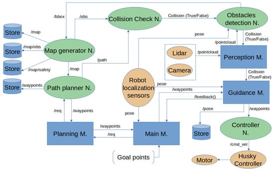 More in detail, as illustrated in Figure 4, the Main module receives a collision-free point-to-point path of waypoints between each pair of goal points from the Planning module, i.e., the Main module subscribes to the topic . Moreover, the Main module has information both on the map and on the proprioceptive sensor-related data, i.e., it subscribes to the topics and , which are computed according to the connected sensors, for localizing the robot on the map. It then sends the generated waypoints to the Guidance module to create a velocity command for the controller to move the robot towards the target point. The Perception module detects any unexpected obstacle, i.e., not present in the available map, that may appear along the path. For each newly detected object along the path, the Perception module evaluates whether it is occluding (blocking) the robot’s path or not. If the object blocks the path, it is considered an obstacle, and the cancels the planned path and waypoints. When this happens, the Main module receives an alert (through the ) and sends a request () to the Planning module to generate a new route considering the initial map updated with the obstacles, the robot’s current location as the initial pose, and the remaining goal points as locations to be visited. All the Store blocks represent the data-storage to handle different variables in different situations when needed, such as during the experimental tests.