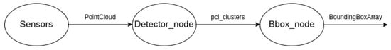 The Perception module architecture is shown in Figure 5. There are two main nodes, called the Detector_node and BoundingBox_node, that are used to identify, localize, and estimate the size of possible obstacles. The Detector_node takes a point cloud as input and generates an array of point-cloud clusters as outputs. A filtered point cloud is used for debugging and visualization the scenario in Rviz, the 3D ROS visualizer. The BoundingBox_node takes as input the array of point-cloud clusters generated by the Detector_node and finds an axis-aligned bounding box for each cluster. The overall module can be decomposed into three main steps: pre-processing, clustering, and bounding-box definition.