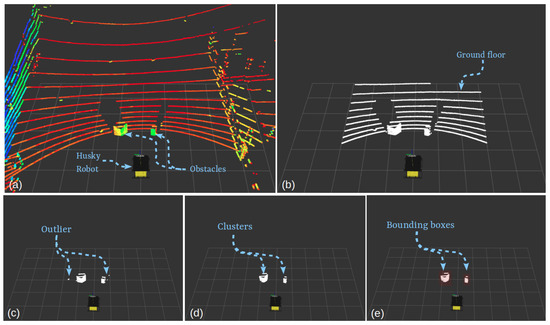 The pre-processing step consists of a series of algorithms to prepare the data for the clustering step. Figure 6 presents an example of the perception module steps. Particularly, the point cloud is downsampled to reduce the computational load by using a voxel grid and pass-through filters (see Figure 6a) that mainly merge and approximate sets of points and cut the data to consider a reduced xyz-range of points. After downsampling the data, the Detector_node performs ground-removal using a plane-model segmentation algorithm [40] with a distance threshold parameter of 0.01 m. In the next step, since the ground is not perfect and the sensor is noisy, sometimes it happens that some points survive the segmentation step; an outlier-removal function is run to remove isolated points that remain after ground removal. Then, a DBSCAN algorithm [41] (see Figure 6b) is used to group all points belonging to the same object. A single point cloud is generated and added to an array for each object detected. The last step of the Perception module framework takes the array of clusters and finds an axis-aligned bounding box for each array element. When the system starts, the map frame is fixed in a known position in the environment and is used as the fixed-reference frame. We use this frame to generate axis-aligned bounding boxes for all the detected obstacles. When point cloud data is received from the sensor, it is filtered and the resulting point cloud is transformed with respect to the map frame. At that point, a bounding-box node generator to find the bounding boxes of the obstacles with coordinates expressed in the map frame (fixed frame) is run. The bounding box obtained is described with three coordinates representing the position of its center and three values representing the dimensions along coordinate axes. The final output of the perception module is published and accessible in the /BoundingBoxArray topic (/bbox in Figure 4).