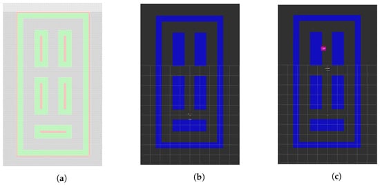 Example of a known map provided in (a) csv, (b) OccupancyGrid free map, and (c) updated map with detected obstacles.
