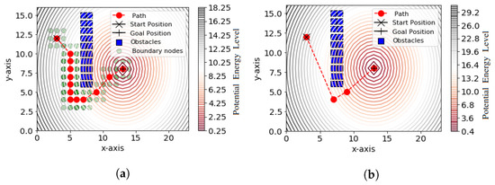 An example of path planning and obstacle avoidance for a mobile robot in a static environment using is illustrated in Figure 8a. Based on the extended , the robot is simulated by a nine-node quadrilateral element. If the nodes are denoted by a vector , the robot’s location is represented by the centroid node , and nodes with represent the eight boundary nodes that help the robot move forward and avoid obstacles. The contour line represents the potential function utilized to direct the robot toward the goal point. It has the lowest potential value at the final destination point, and increases as the robot moves away. As shown in Figure 8a, the line color represents the potential value, i.e., red corresponds to the lowest potential value, and dark gray corresponds to the highest potential value. The sequence of the red circles represents the best solution to IFP. The simulated robot can only move in eight possible directions. In each iteration, the current location of the robot and boundary nodes move in one particular direction. Additionally, this method uses an optimization technique based on the lowest potential value to let the robot find the path and yield fast convergence. The node with the lowest potential value is chosen as the best position among all boundary nodes, and the robot updates its position to the best position.