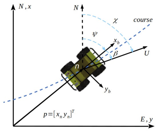 where is the heading angle of the vehicle. We used the global reference frame G{x, y} and the body-coordinate frame B{xb, yb} to describe the robot’s motion, location, and orientation. As shown in Figure 9, the x axis of the global coordinate system G{x, y} points toward the North, the y axis points toward the East, and the z axis indicates downward. The body-fixed frame B{xb, yb} moves with the robot, the x axis points toward the head of the robot, the y axis points toward the right, the z axis indicates downward normal to the x–y surface, and U denotes the corresponding speed. The angle represents the slide-slip angle, and the angle represents the orientation angle of the mobile robot measured from the positive N axis of the body-fixed system. The point n denotes the center of the robot, which is a Cartesian coordinate about a global coordinate frame denoted by (, ). is the transformation matrix from B{xb, yb} to G{x, y}, which is given by