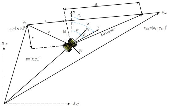 Figure 9 and Figure 10 show the geometry of the LOS guidance problem and main variables. As shown in the figures, the position of the robot in global coordinates can be written as , and the corresponding speed is defined as