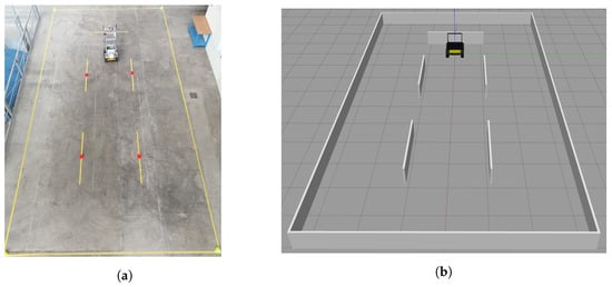 For the initial evaluation of the implemented framework, a lab-emulated orchard was created in which parallel rows of tree were considered fixed obstacles on the map. The experimental emulated scenario is shown in Figure 12a, and the Gazebo digital twin is shown in Figure 12b.