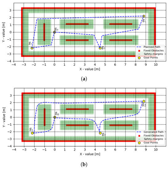 Figure 13 and Figure 14 show the planned path for a mobile robot using in two testing scenarios as well as the performance of the navigation strategy in both testing scenarios. In the first test configuration (see Figure 13, the robot starts moving from initial position (0, 0) to visit three fixed goal points (, , and ) added to the pre-built map. The goal points were located at (−2.2, −2.2), (8.8, 2.2), and (4.5, −2.2). The red cells express the fixed obstacles, blue dashed lines represent the planned path of the robot, yellow circles in the figure define the goal points, and green cells represent the area related to the safety margin introduced to allow the robot to safely navigate and steer. In this study, we adopted a safety margin around obstacles to avoid the possibility of overlapping the paths traced by the robot overlapping with obstacles. As it can be appreciated in Figure 13a, the robot might move very close to the obstacle. Therefore, a certain safety margin for anti-collision has to be assured. Considering the robot dimensions and footprint, it has been defined with a constant-size of six grid cells. All fixed obstacles are given in parallel lines, and the goal points are given between obstacles. The robot localization sensors are utilized to determine where a mobile robot is located within the environment. In this test, a filtered-odometry, i.e., encoders and IMU, approach has been adopted. The current coordinates of the robot are compared with the predefined ranges of the fixed goal point, and if the robot is within the range, the coordinates of the next destination point are considered.
