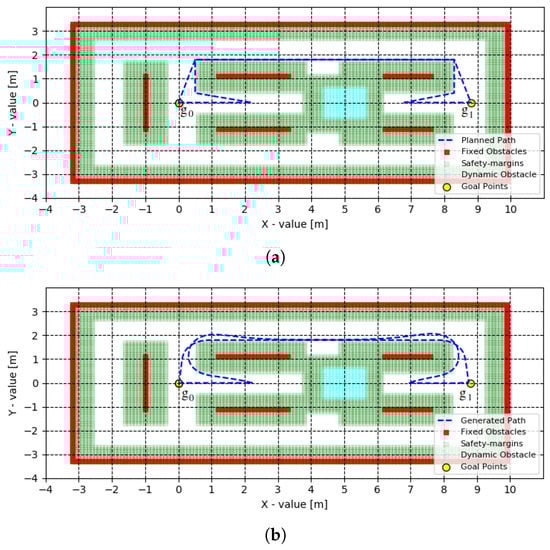 Simulated environment with fixed and dynamic obstacles: (a) planned and replanned path using ; (b) path executed by the robot.