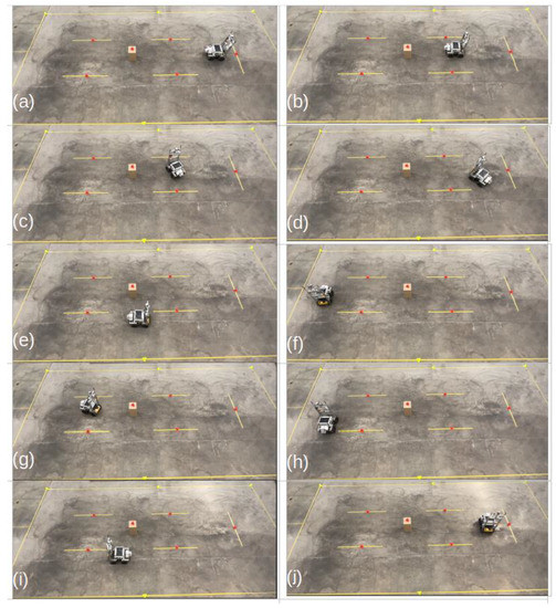 From (a) start to (j) end: sequence of screenshots of the simulated orchard environment with obstacles (crop rows) showing the navigation test of the robot prototype in the physical environment, with the fixed obstacles represented by yellow lines, and the dynamic obstacle, not present in the predefined map, represented by the box.