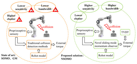 - In order to achieve the required bandwidth and noise immunity for collision detection, a new reaching law (NRL) is designed. The NSOMO is also proposed, exhibiting a slight external torque detection delay, a high external torque estimation accuracy and a small jitter phenomenon. Furthermore, NSOMO can be applied to any robot manipulator, providing a new idea for collision detection technology.