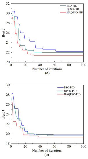 The main operating parameters that need to be determined in QPSO include population size, the number of iterations, and the range of search. To the best of our knowledge, there is no mature theory to choose reasonable values for these parameters [35], but ranges have been studied in some research [34,36,37,38]. According to the results of the literature discussion, the parameters of PSO-PID, QPSO-PID, and HAQPSO-PID are established as shown in Table 8.