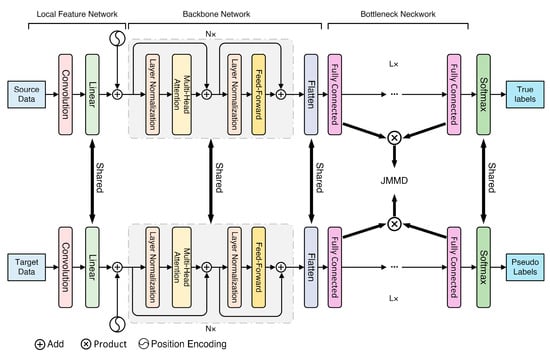 In addition, vibration signals captured by the EMA are susceptible to contamination by sensor locations as a result of its complex construction. Vibration data collected at a different location has a negative impact on both the quantity and quality of information. It may be argued that cross-sensor domain adaptation presents a challenge to fault diagnosis in EMA. In order to overcome this problem, a cross-sensor fault classifier needs to be built using learned source domain knowledge. Unfortunately, little research has been conducted on this topic. Li et al. [] proposed a Generative Adversarial Network (GAN)-based approach for marginal domain fusion of bearing data, combined with parallel unsupervised data, to converge on conditional distribution alignments. However, GAN is not optimal for discriminative tasks, and it is sometimes limited to smaller shifts on these tasks []. A CNN and Maximum Mean Discrepancy (MMD) [] were utilized by Pandhare et al. [] for fault diagnosis across different sensor locations of a ball screw. CNN treats all data equally and lacks both pertinence and relevance, making it difficult for viewers to discover relationships between targets []. As of this moment, CNN has a limited ability to provide long-ranged information because of its receptive fields that are localized []. Though cross-sensor domain fault diagnosis is exceedingly common in real industrial scenarios, various aspects of these problems have not been adequately addressed.