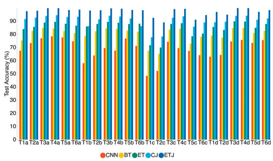 The CJ and ETJ methods were compared for the most challenging task, T1c. In Figure 7c,d, the visualization results of the CJ and ETJ for task T1c are presented. Although JMMD minimizes the discrepancy between the source and target domain distributions, the CJ method is still generally inefficient, with a high rate of misclassification. Utilizing the enhanced Transformer in the same task significantly improves the performance. The three fault classes still exhibit domain gaps, even after a satisfactory clustering phenomenon has been achieved in the four classes. Consequently, negative testing performances are seen for all three classes, as illustrated by Figure 7d. Comparatively, the other methods are significantly less capable of achieving cross-sensor domain adaptation for task T1c, resulting in very low numerical test accuracy, as shown in Table 5.