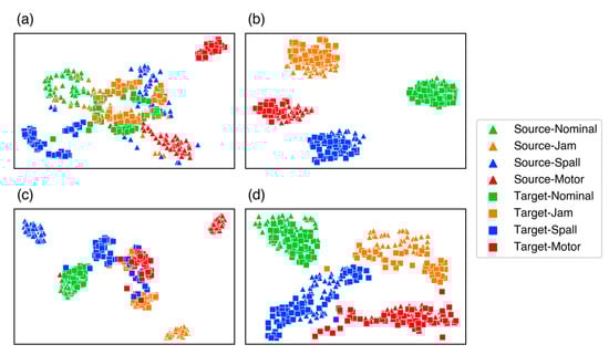 A comparison of the CNN and ETJ methods in task T3d is presented in Figure 7a,b. With the CNN method, even for the simplest tasks, there are significant discrepancies between the source and target domains. Considering the same health state of different domains, the data are projected into different places. Therefore, the CNN method acquires a low diagnostic accuracy in the target domain. Based on this finding, it appears that well-established approaches cannot be used directly to generalize the knowledge learned under source supervision into target domains. Figure 7b demonstrates that the data for the two domains under the same health state are accurately mapped into close high-level feature spaces using the proposed method. Most features with the same label across the two domains can be clustered together, and only a few samples were incorrectly classified.