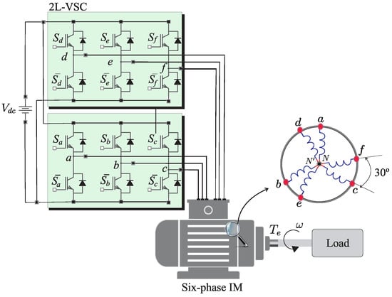 Consider an asymmetrical six-phase IM drive powered by two two-level voltage source converters (2L-VSCs), as shown in Figure 1), with the model [18] given by: