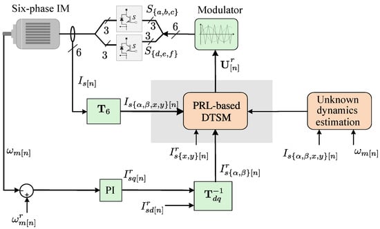 Multiphase motors with a number of phases greater than three have recently been involved in high-power and high-reliability real-life implementations, such as in electric vehicles, ship propulsion, and wind energy conversion systems [1,2]. Their innate fault-tolerant abilities without needing extra hardware are still considered their most practical benefit [3]. Moreover, their additional degrees of freedom have opened the window for miscellaneous nontraditional objectives at the expense of the need for more advanced control strategies [4]. For that reason, a myriad of papers are now available regarding the implementation of control techniques for multiphase machines, and these range from classic controllers (field-oriented control and direct torque control) to more sophisticated ones (model predictive control (MPC) and sliding mode control (SMC)) [5,6].