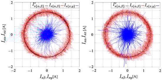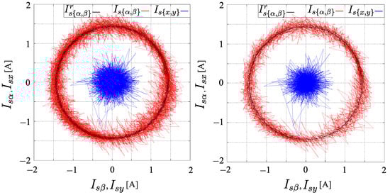 Stator currents for the proposed enhanced PRL-based DTSMC in the () and () planes for different speed conditions . Stator currents for the proposed PRL-based DTSMC in the () and () planes for a speed of (left) 1000 or (right) 1500 rpm.