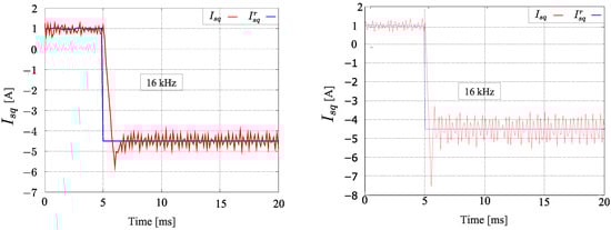 Transient condition of the q-plane current of a speed reversal action from 1000 to rpm from at a sampling frequency of 16 kHz. Transient condition of the q-plane current of a speed reversal action from 1000 to rpm from at a sampling frequency of 16 kHz for the proposed controller (left) and a basic DTSMC version (right).