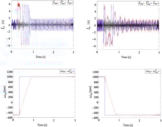 Two reversal tests were performed to analyze the dynamic behavior of the proposed current controller. Figure 7 presents the results obtained when the speed was varied from −500 to 1000 rpm and from 1000 to −500 rpm. We could verify the proper performance of the current tracking.