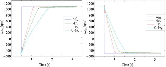 Transient behavior of a speed reversal action from . The first results are from −500 to 1000 rpm, and then from 1000 to −500 rpm, with different values of .