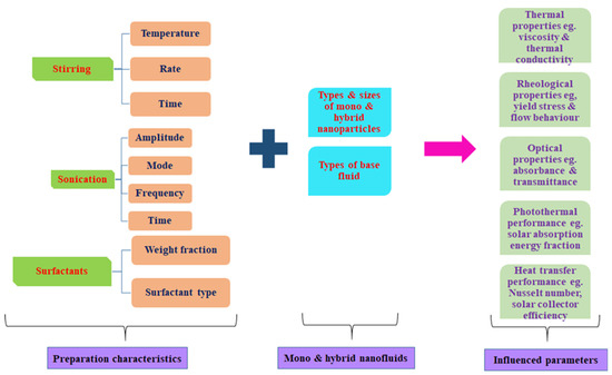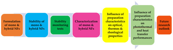 Based on the above comments and the available literature in the public domain regarding the influence of stability on the thermal, optical, and rheological properties, photothermal conversion, and performance characteristics of NFs, we thought it necessary to conduct an overview of this laudable subject. The effects of the preparation methods (one- and two-step strategy), sonication characteristics (sonication mode, time, frequency, power/energy density, and amplitude), stirring, and the deployment of surfactants on stability that consequently impact the properties and performance of mono and hybrid NFs in different areas of application have been well compiled and critically reviewed. This is prompted by the need to bring to the front burner the challenges and ways forward concerning the stability of NFs (mono and hybrid) and the attendant problems. A major feature of this review paper is the foremost consideration of mono and hybrid NFs for their stability, heat transfer performances, and thermal properties as influenced by the preparation characteristics. This work is expected to be a good guide for researchers in NF studies toward achieving good stability and improved results. This paper is divided into six parts. The first part is the general introduction of the paper. In the second part, the preparation methods, characterization techniques, and stability monitoring tests for mono and hybrid NFs are highlighted and discussed. Part 3 involves the effects of preparation characteristics of MNFs on their stability, properties (thermal, optical, and rheological), and performances (photothermal conversion, heat transfer, and solar collector efficiency), while part 4 addresses the influence of the preparation characteristics of HNFs on their stability, thermal, optical, and rheological properties, and heat transfer performances. The challenges and future research directions are discussed in part 5 of this paper. Finally, the conclusion and recommendations are provided in part 6. A schematic diagram of the work carried out in this paper is provided in Figure 1.