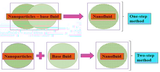 MNFs and HNFs are formulated through the suspension of MNPs and HNPs, respectively, into conventional thermal fluids, namely, base fluids, of which their stability is very important to the measurement of the thermophysical properties and convective studies. Fundamentally, MNFs and HNFs are formulated using a one- and two-step process (Figure 2). By this, the latter entails two processes, namely, (i) synthesis of MNPs or HNPs in the powdery form and (ii) suspension of MNPs or HNPs into the base fluids. The most reported process in the literature is the two-step process for the formulation of MNFs and HNFs, which can encourage their large-scale formulation at a low cost and an industrial utilization. The shortcoming of the two-step process relates to the sedimentation and agglomeration of MNPs and HNPs due to the Van der Waals forces of attraction among the particles [92]. The one-step process consists of the simultaneous production of MNFs and HNFs by way of synthesis and suspension of MNPs and HNPs in the base fluids. This technique is advantageous as it improves the homogeneity and stability of MNFs and HNFs and eliminates arduous procedures, such as drying and storing in comparison with the single-step process by reducing the agglomeration tendency of MNPs and HNPs [92,93]. However, the industrial application of this technique is impracticable except for low vapor-pressure fluids. This technique is also not cost-effective [94]. In addition, various one-step process techniques have been reported in the literature [93,95,96].