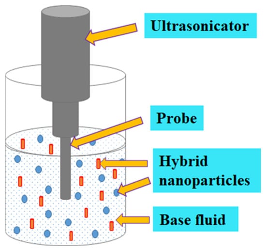 Sonication is one of the techniques deployed to obtain homogeneous mixtures of NPs suspended in selected base fluids. Several studies demonstrated that sonication affected κ, absorbance wavelength, μ, cluster size, surfactants, the diameter of CNTs, and particle size [74,78,79,85,105,106,107]. For NFs, a sonication time spanning a few minutes to several hours has been documented. It can be deduced that an optimum sonication time (mainly due to the Brownian motion of MNPs or HNPs) occurred where the variable investigated either reduced (for μ and κ) or increased (for CNT diameter, particle, and cluster size). An optimum sonication time ranging from 12 min [108] to 60 h [105] has been reported in the literature for MNFs and HNFs. This reflects the need to optimize sonication time as it relates to other variables to achieve improved stability. However, this is mostly not the case for most of the studies on the formulation of MNFs and HNFs, except for very limited studies that have optimized the sonication parameters [74,85,109]. Sonication of NFs has been reported to be carried out using the following three different types of ultrasonicators: probe-type, sonication-bath type, and shaker-type [68,80,110]. Figure 3 shows the sonication of HNF.