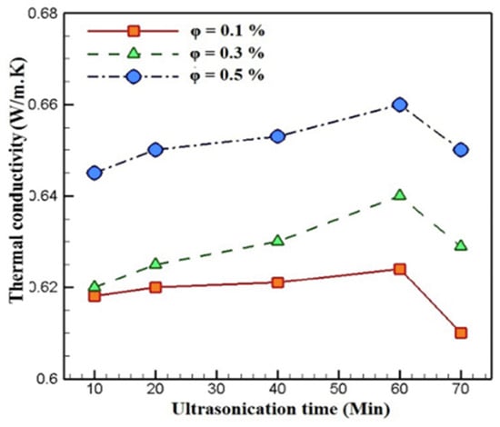 The influence of sonication time (4–100 h) on the κ, nanoparticle cluster size, and stability of ZnO/EG NF (0.5–3.75 vol%) was studied [161]. Increasing the sonication time from 4 h to 60 h results in a decrease in nanoparticle cluster size (459–91 nm) and an increase of κ (21–40%), in which the reverse is observed after a further increase in the sonication time. This implies an improvement of the stability of ZnO/EG NF as the sonication time increased to 60 h through a nanoparticle cluster size reduction leading to the enhancement of κ. After 60 h, the cluster size of the NF increases, leading to the instability and reduction of κ. Using the optimum sonication time of 60 h, a relatively constant κ is observed with no sedimentation for 30 days after preparing 1 vol% ZnO/EG NF. The stability of MWCNT/DW NF under varying sonication times (5–120 min), weight concentrations (0.1–1.5 wt%), and SDS concentrations (0.01–0.4 wt%) was reported [162]. The results demonstrate an optimum stability condition at an optimum sonication time of 90 min (1 × 105 J) and an SDS concentration of 1.5 wt% for MWCNT/DW NF with a weight concentration of 0.1–1.4 wt%, as indicated by the constant values of their absorbance. It is observed that increasing the SDS concentration causes an increase in the sonication energy required to formulate the MWCNT/DW NF.