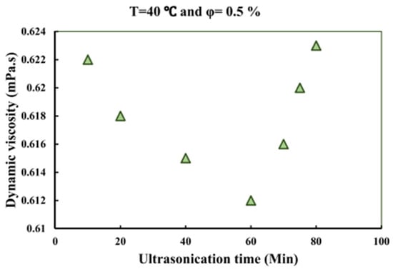 Viscosity of MWCNT/water NF against ultrasonication time at the temperature of 40 °C and concentration of 0.5%. Adapted from [149].