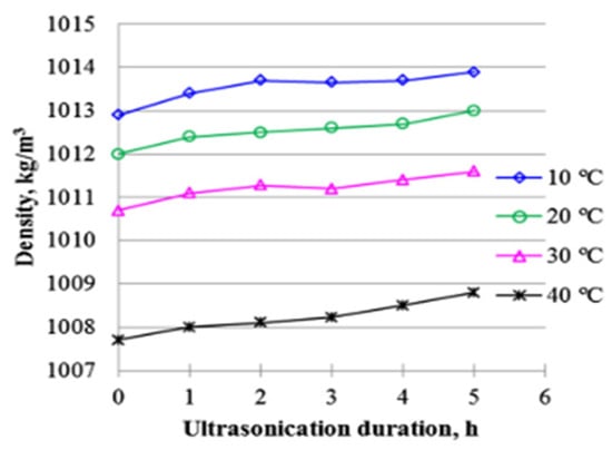 Influence of ultrasonication duration on density of 0.5 vol% Al2O3-water NF at different temperatures. Adapted from [150].
