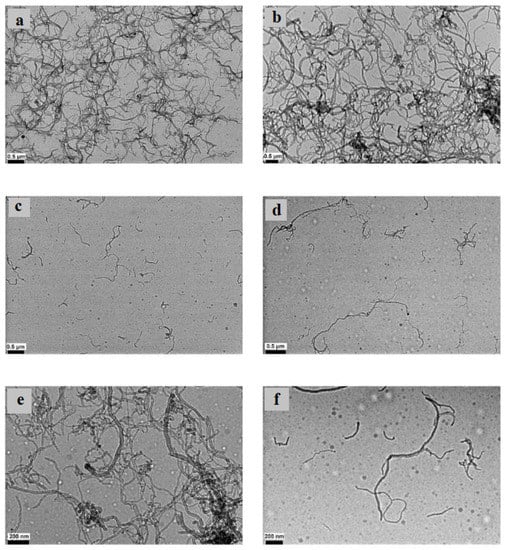 Images of Wet-TEM of 1 wt% MWCNT + 0.25 wt% GA NF sonicated for: (a) 20 min at 0.5 μm scale, (b) 40 min at 0.5 μm scale, (c) 60 min at 0.5 μm scale, (d) 80 min at 0.5 μm scale, (e) 40 min at 200 nm scale, and (f) 80 min at 200 nm scale. Adapted from [155].